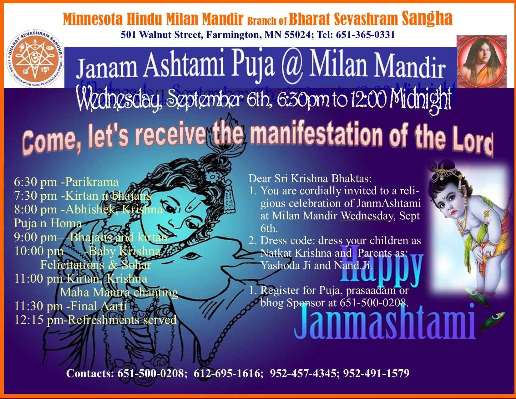 Janam Ashtami Puja, Minnesota Hindu Milan Mandir, Wednesday, September 6